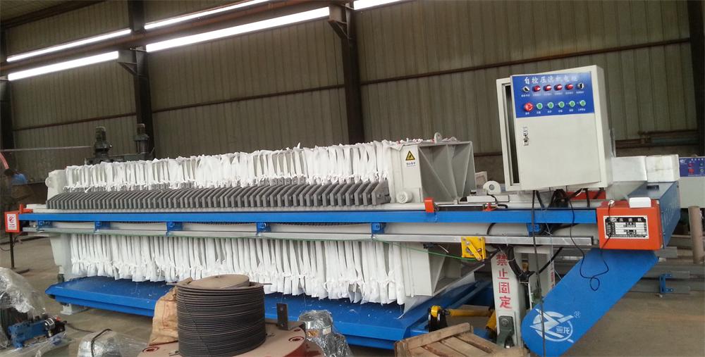 濾布單行走式自動(dòng)廂式壓濾機(jī)工作時(shí)料漿從頂部進(jìn)料口送入,經(jīng)過進(jìn)料、壓榨、洗滌、吹風(fēng)干燥后,油缸啟動(dòng),將各濾室同時(shí)打開。濾布包著濾餅向下行走,濾餅很容易從濾布上卸除,同時(shí)高壓水對濾布進(jìn)行清洗。整個(gè)過程能自動(dòng)實(shí)現(xiàn),大大節(jié)省了人力操作。
